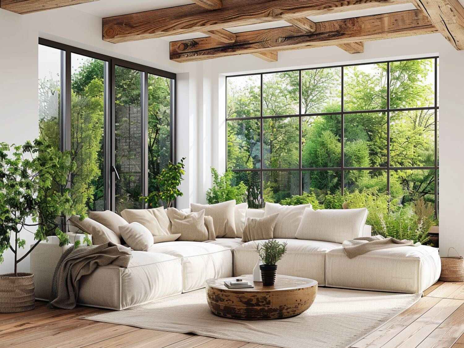 2. Narożnik w odcieniach ziemi – ciepłe połączenie z drewnem