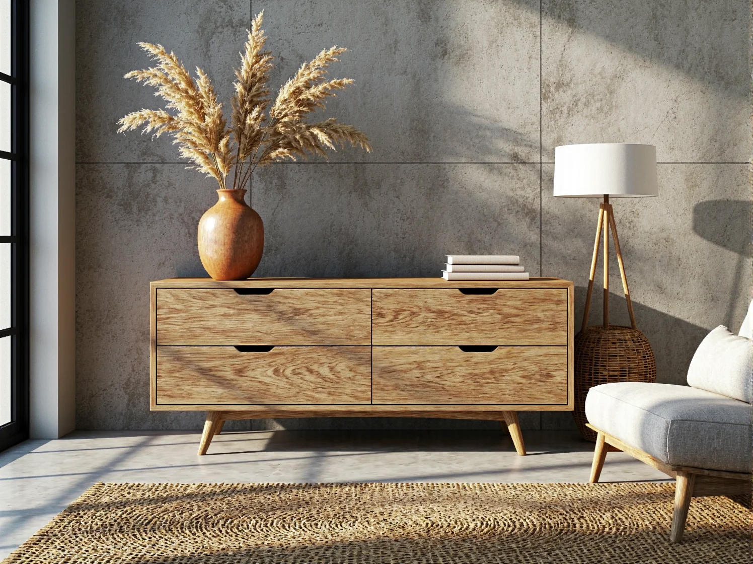 Japandi to gra kontrastów. O ile baza często jest jasna, o tyle meble – w tym komody – mogą stanowić mocny, ciemny akcent, nawiązujący do tradycyjnych japońskich wnętrz. Ciemne drewno dodaje elegancji, tajemniczości i „uziemia” aranżację.